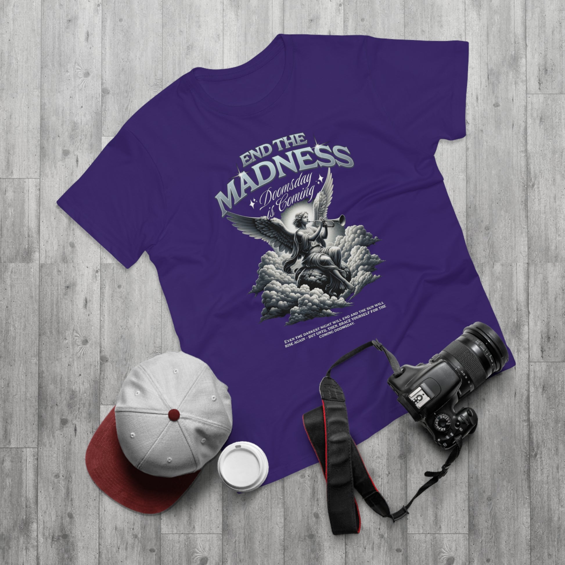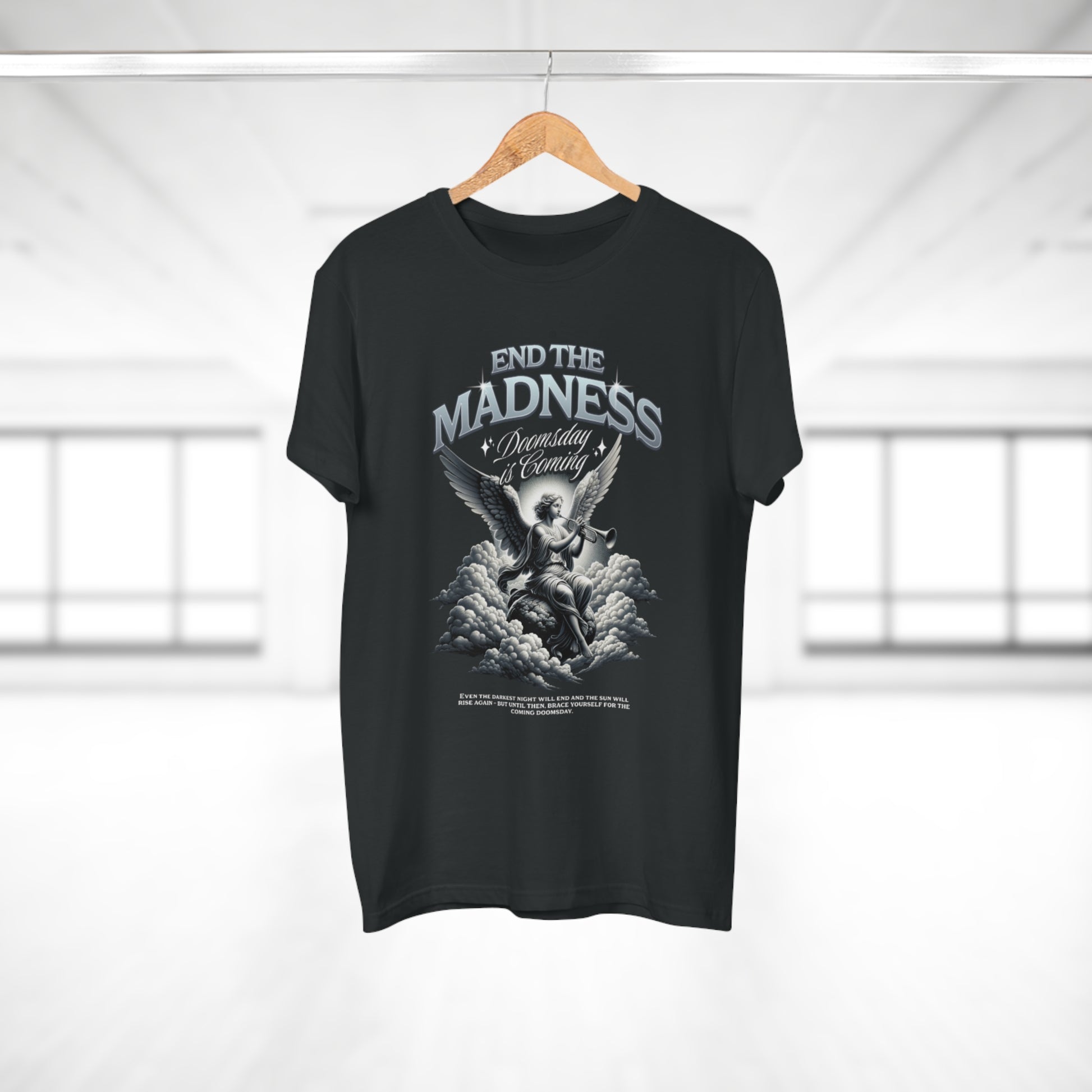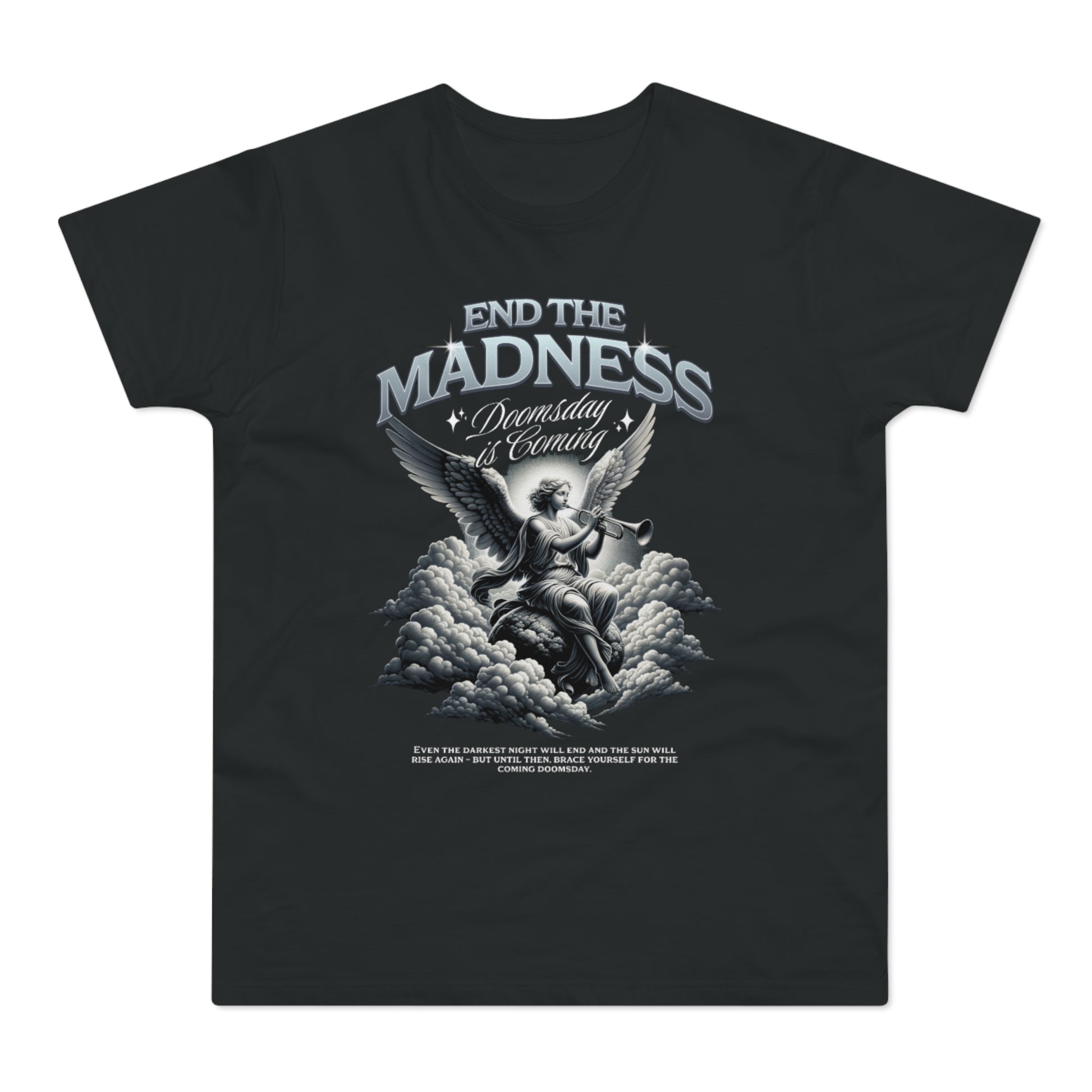A lightweight men's tee that carries a bold, vintage-rock energy. The front art—an angelic figure rising from clouds beneath the headline “END THE MADNESS”—reads like a faded concert poster or old-school album cover. It feels worn-in and rebellious, built for someone who wants their clothes to speak with attitude rather than slogans. The soft, combed ringspun cotton drapes comfortably, while the tubular knit and ribbed collar keep the silhouette clean and the neckline from stretching. Wear it layered under a denim jacket on an evening out, or loose with jeans and boots for a gritty, lived-in look that still feels effortless.